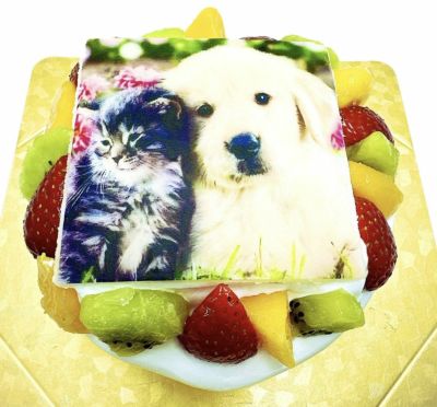 主役のワンコ・ニャンコがケーキの真ん中になるよう画像の編集、配置をさせていただきますが、2匹、3匹と複数写っているワンコやニャンコが離れていたり、画像の端の方に写っていたりすると、飾り付けのためにケーキの周りに絞るクリームで隠れてしまう場合があります。